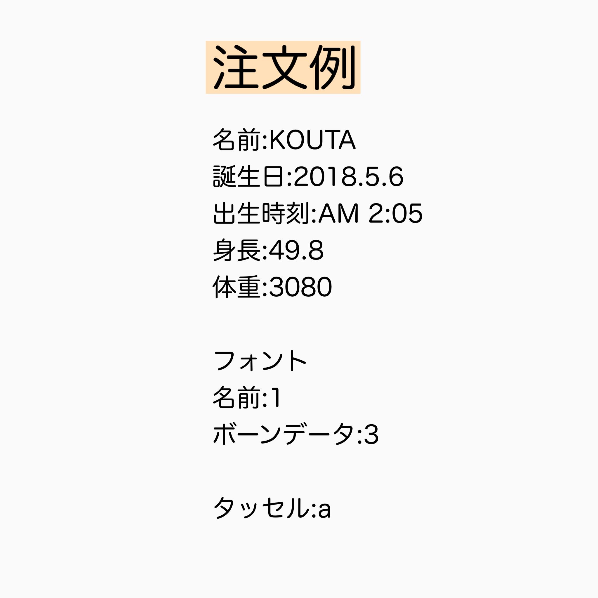 商品説明:お子さんのお名前、生年月日、出生時刻、身長、体重を記したボーンタペストリーです!